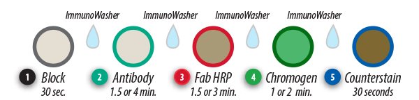 - Continue IHC detection protocol. Wash slides between each step with ImmunoDNA washer, Tris or PBS Buffer solution.