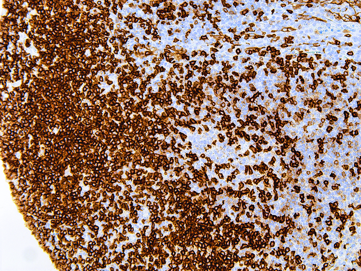 Cluster of differentiation 5 (CD5) is expressed in high levels on the surface of T cells, while controversy surrounds the expression levels and role of CD5 in B cells. As a part of a diagnostic panel, its utility lies predominantly as a marker for T cells, with over 70% of T cell neoplasms expressing CD5. In particular, it is correlated with chronic lymphocytic leukemia/small lymphocytic lymphomas, mantle cell lymphoma, as well as a subset of diffuse large B cell lymphomas. CD5 demonstrates positive expression in thymic carcinomas, and is not as sensitive as CD3. CD5 also has value as a prognostic indicator, being associated with poor prognosis in acute T cell lymphoblastic leukemia.