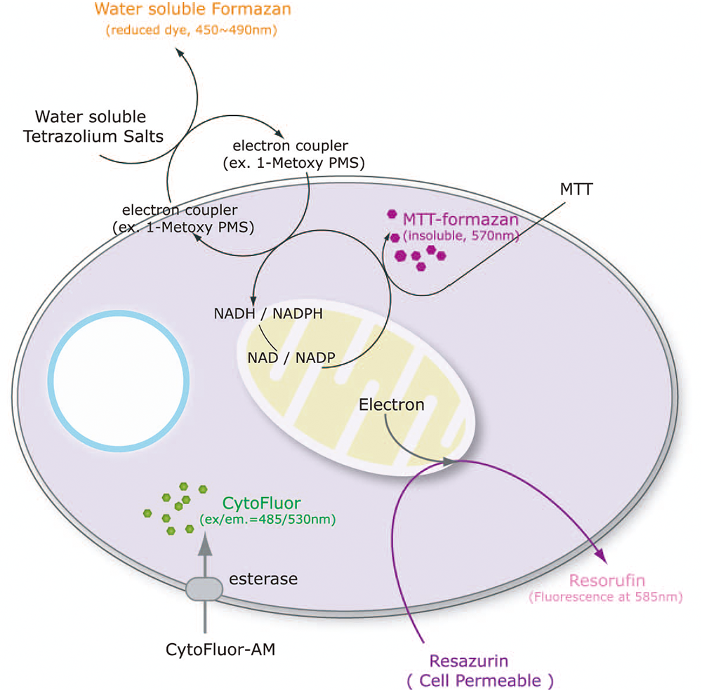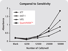 Quanti-Max™ WST-8 Cell Viability Assay Kit measures the amount of living cells using WST-8 and can be used for Cell Viability, Proliferation & Cytotoxicity Assay. The key component, WST-8, is a highly water-soluble Tetrazolium Salt that reacts with dehydrogenase in living cells to form an orange-colored, water-soluble formazan product. Dehydrogenase is an enzyme that exists in the mitochondrial electron transport chain of metabolically active cells and is active only in living cells.