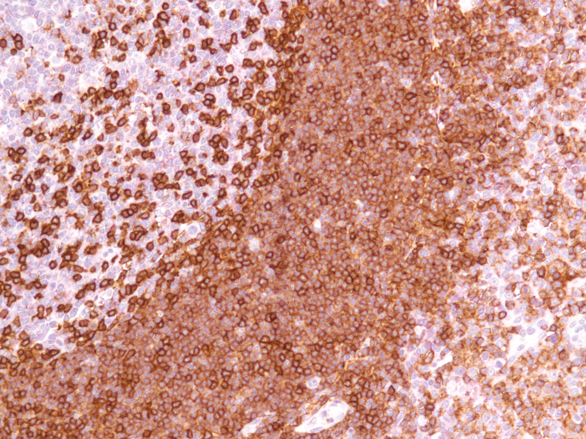 CD45R, also known as MB1, is an isoform of CD45 that is a member of the protein tyrosine phosphatase (PTPase) family. CD45R is expressed specifically on the surface of hematopoietic cells, and has demonstrated function as a regulator of the antigen and cytokine receptor signalling of B and T cells. Given that the antigen is located in the membrane of all B cells, with the exception of plasma cells and some mature T cells, Anti-CD45R exhibits specific reactivity with most B lymphocytes. The use of Anti-CD45R is primarily useful in distinguishing B cell lymphomas from T cell lymphomas, with specific reactivity to follicle center cells, mantle cells, some medullary thymocytes, and 80% of B cell lymphomas.