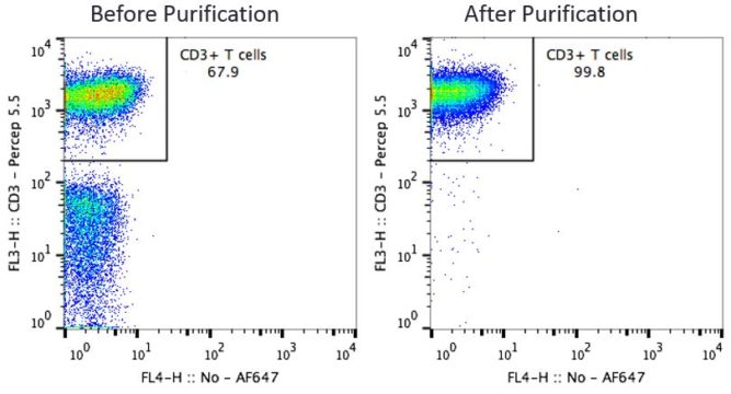 A small aliquot of cells was tested for post-sort purity by flow cytometry analysis. Purity of pan T cells, as defined by CD3 expression, was > 99% (Figure 1).