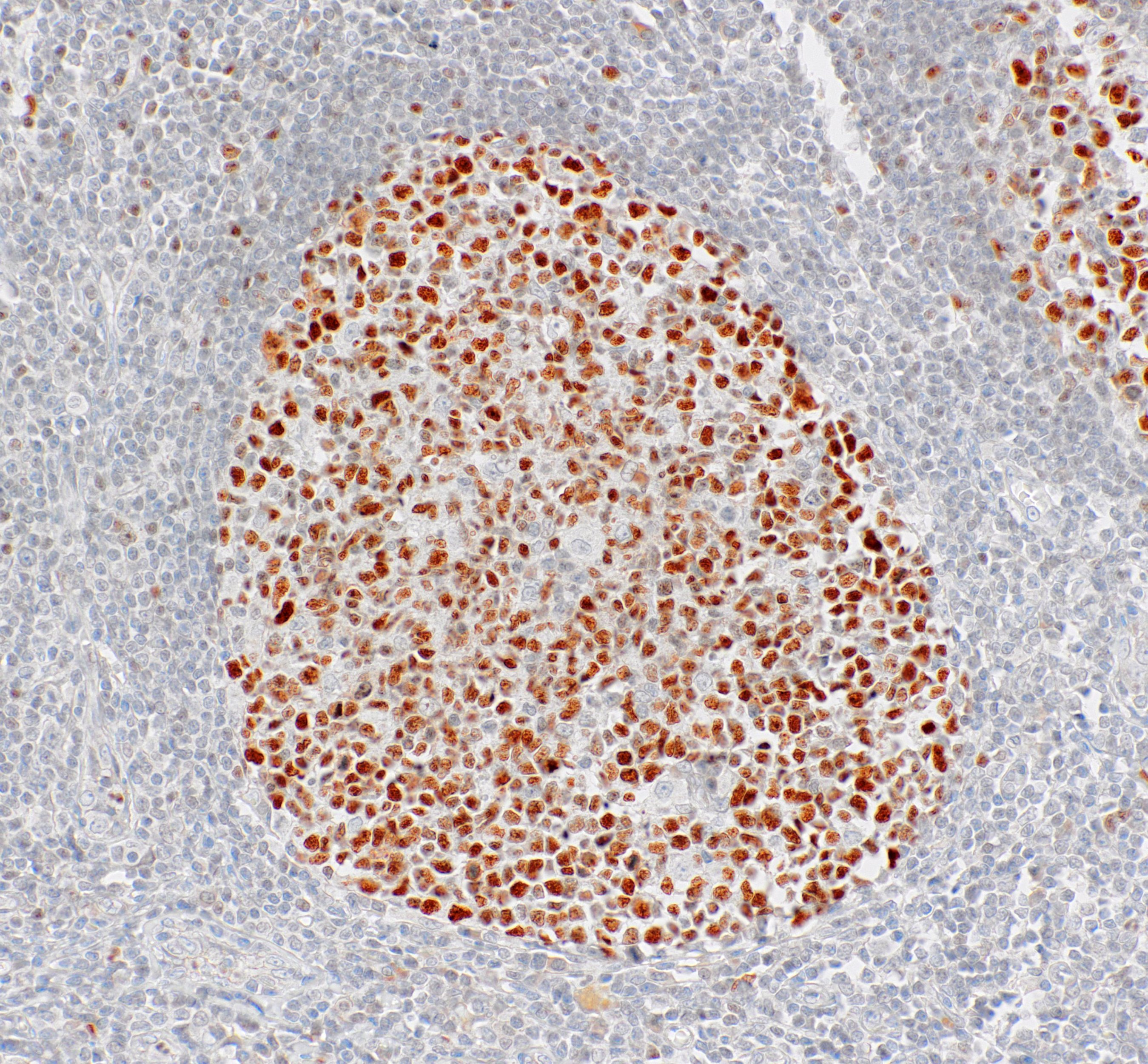 B-Cell Lymphoma 6 (BCL6) is a zinc finger transcription factor. BCL6 expression is seen in follicular lymphomas, Burkitt's lymphoma, angioimmunoblastic T-cell lymphoma, and nodular lymphocyte-predominant Hodgkin's lymphoma. Together with BCL2, BCL6 is often used to distinguish neoplastic follicles from those in benign hyperplasia, and to aid in the classification of mantle cell lymphomas and nodular lymphocyte-predominant Hodgkin's lymphoma.