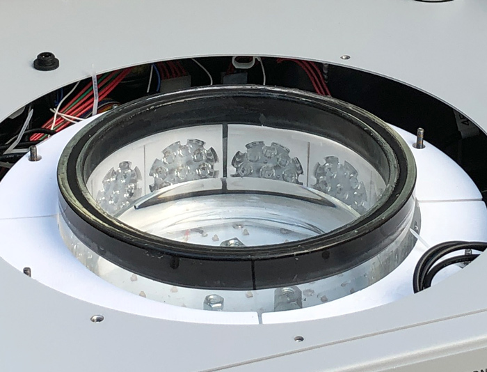 Four light modules surround the reaction chamber and one light module sits underneath.