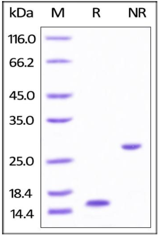 The protein has a calculated MW of 13 kDa. The protein migrates as 14 kDa under reducing (R) condition and 27 kDa under non-reducing (NR) condition (SDS-PAGE).