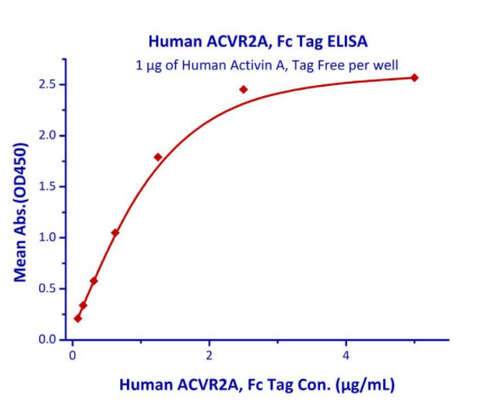 Immobilized Human Activin A, Tag Free 10μg/mL (100 μL/well) can bind Human ACVR2A, Fc Tag with a linear range of 0.08-0.625 μg/mL (QC tested).