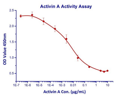 The bio-activity of Activin A was determined by dose-dependent inhibition of the proliferation of MPC-11 cells. The EC50 for this effect is typically ≤ 9.5ng/ml (Routinely tested).