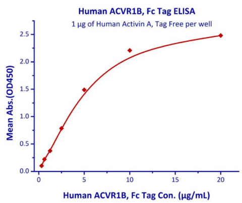 Immobilized Human Activin A, Tag Free at 10μg/mL (100 μL/well) can bind Human ACVR1B, Fc Tag with a linear range of 0.3-2.5 μg/mL (QC tested).