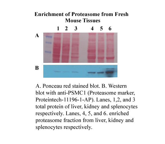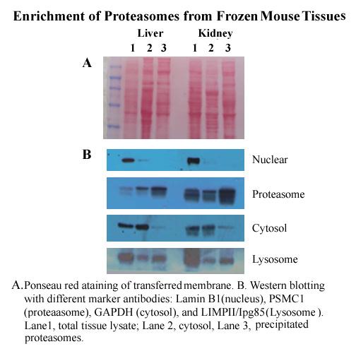 The proteasome is a non-lysosome protein degradation system that requires metabolic energy and polymerization of ubiquitin. The 26S proteasome is made up of two subcomplexes (a 20S proteasome and one or two19S regulatory particles). Rapid and gentle isolation of proteasome from cells/tissues is essential for the studies of proteasome structure and function. The proteasomes have been found mainly localized in cytosol but also detected in nucleus. Traditionally, ultracentrifugation and affinity isolation are the most common methods for isolation of proteasomes. These methods, though relatively effective, are usually time consuming with low yield. Many affinity-based methods require harsh elution condition that may affect the activity of isolated proteasomes and limit certain downstream applications. To overcome these shortcomings, we have developed a spin-column based technology using a proprietary precipitation buffer for enrichment of proteasome from cytosol by first removing nuclei and majority of organelles followed by preferential precipitation of cytosolic proteasomes. The nuclear proteasomes are excluded with this kit (Nuclear Proteasome Enrichment Kit is available under Cat # PN-041). The protocol is simple and rapid with high yield. The gentle protocol maintains the association of proteasomes with ubiquitin and other proteins. This kit is useful for the studies of proteasome structure and function. The enriched proteasomes can also be used as a starting material for affinity purification.