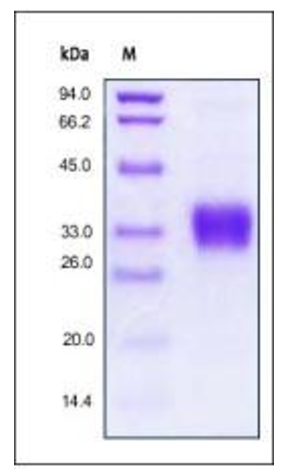The protein has a calculated MW of 18.4 kDa. The protein migrates as 30-37 kDa on a SDS-PAGE gel under reducing (R) condition due to glycosylation.