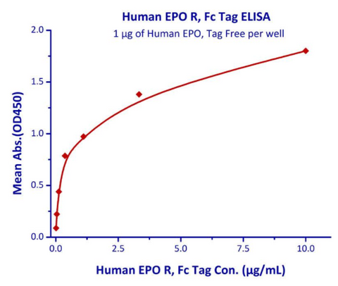 Immobilized Human EPO, Tag Free at 10μg/mL (100 μL/well) can bind Human EPO R, Fc Tag0020with a linear range of 0.013-0.12 μg/mL (Routinely tested).