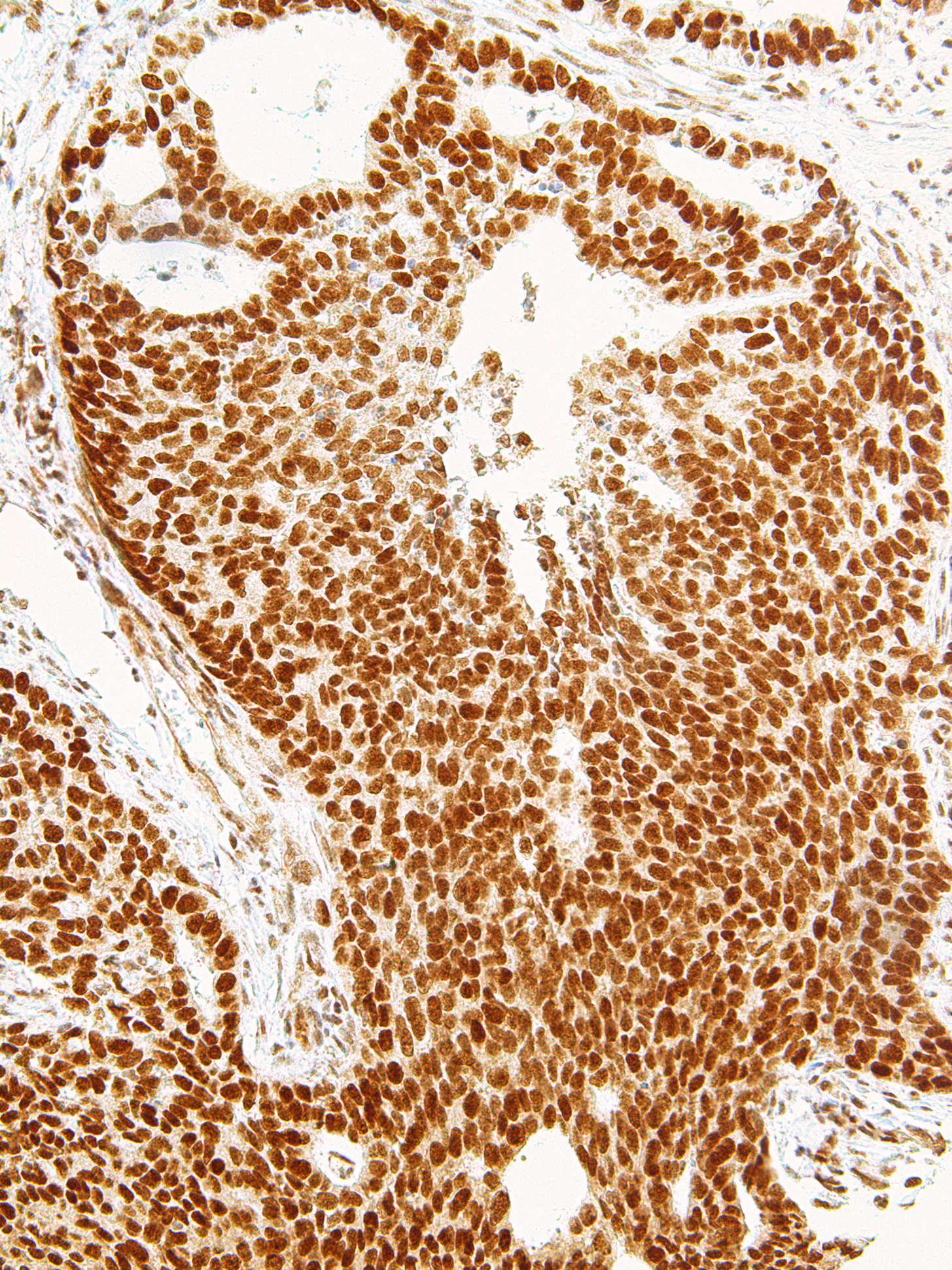 Enhancer of Zeste Homolog 2 (EZH2) is a methylase of histone H3 that silences gene expression in those regions. EZH2 is overexpressed or mutated in gastric, prostate, uterine, breast, and renal cell cancers, as well as in melanoma and most B- and T-cell lymphomas. Although EZH2 is usually present in follicular centers, it is not expressed in the mantle zones, plasma cells, follicular or interfollicular T-lymphocytes, natural killer T-lymphocytes, plasmacytoma, lymphoplasmacytic lymphoma, or MALT lymphoma. EZH2 is rarely present in normal breast duct epithelium and in normal and hyperplastic lymph node. Anti-EZH2 is also useful for detecting lymphoma and non-small cell lung cancers. EZH2 is associated with tumour proliferation and can be used in staining panels to distinguish aggressive lymphomas from less aggressive lymphomas or normal cells.