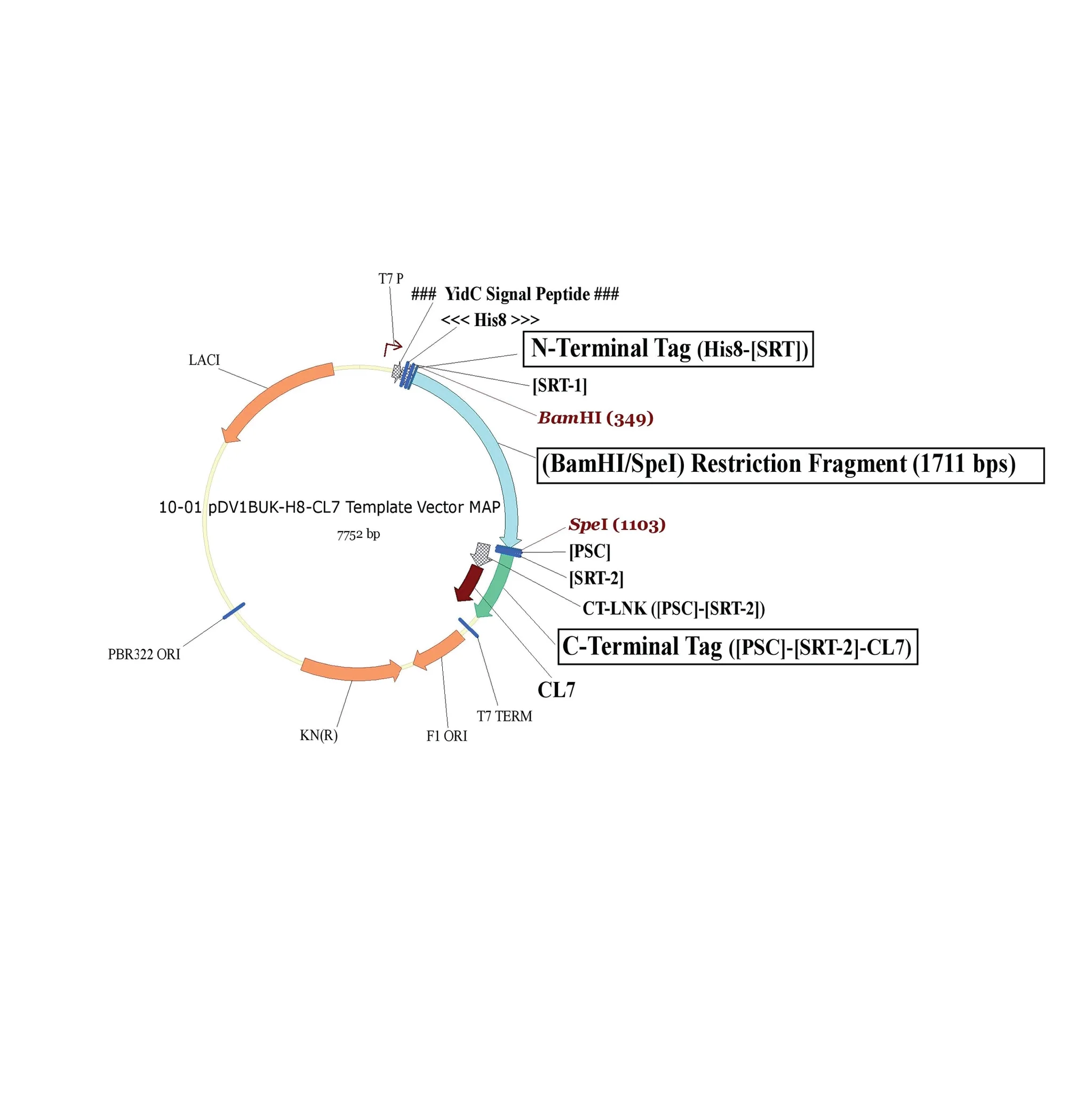 Plasmid #10 contains two SRT cleavage sites, one downstream of the His8 tag and one upstream of the CL7 tag. The PSC and second SRT cleavage sites are incorporated into an 82-amino acid linker/spacer region downstream of the target insertion site.