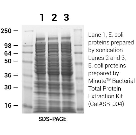 Minute™ Bacterial Total Protein Extraction Kit is composed of optimized denaturing cell lysis buffers and protein extraction filter cartridges with 2.0 ml collection tubes. The kit is designed to quickly extract denatured proteins from bacteria. It contains sufficient materials for the extraction of total proteins from a 100 ml E. coli culture.