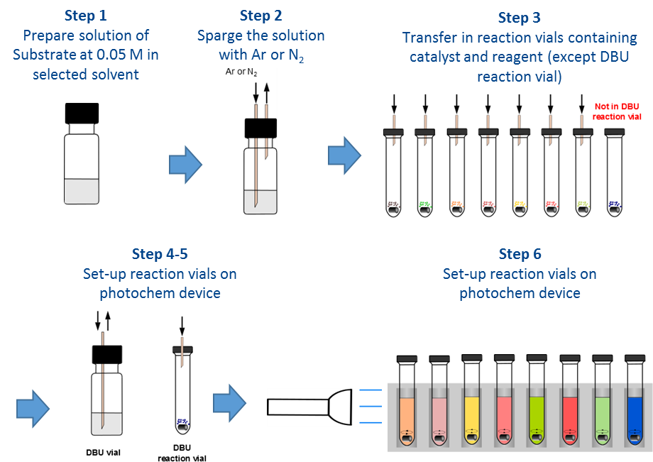 Add full contents to remaining DBU reaction vial. - Stir the reaction vials for 5 minutes prior to turning on the light to allow catalysts to fully dissolve (some bases will remain insoluble). The card containing the vials can be placed directly on the opening of the photochemistry device.