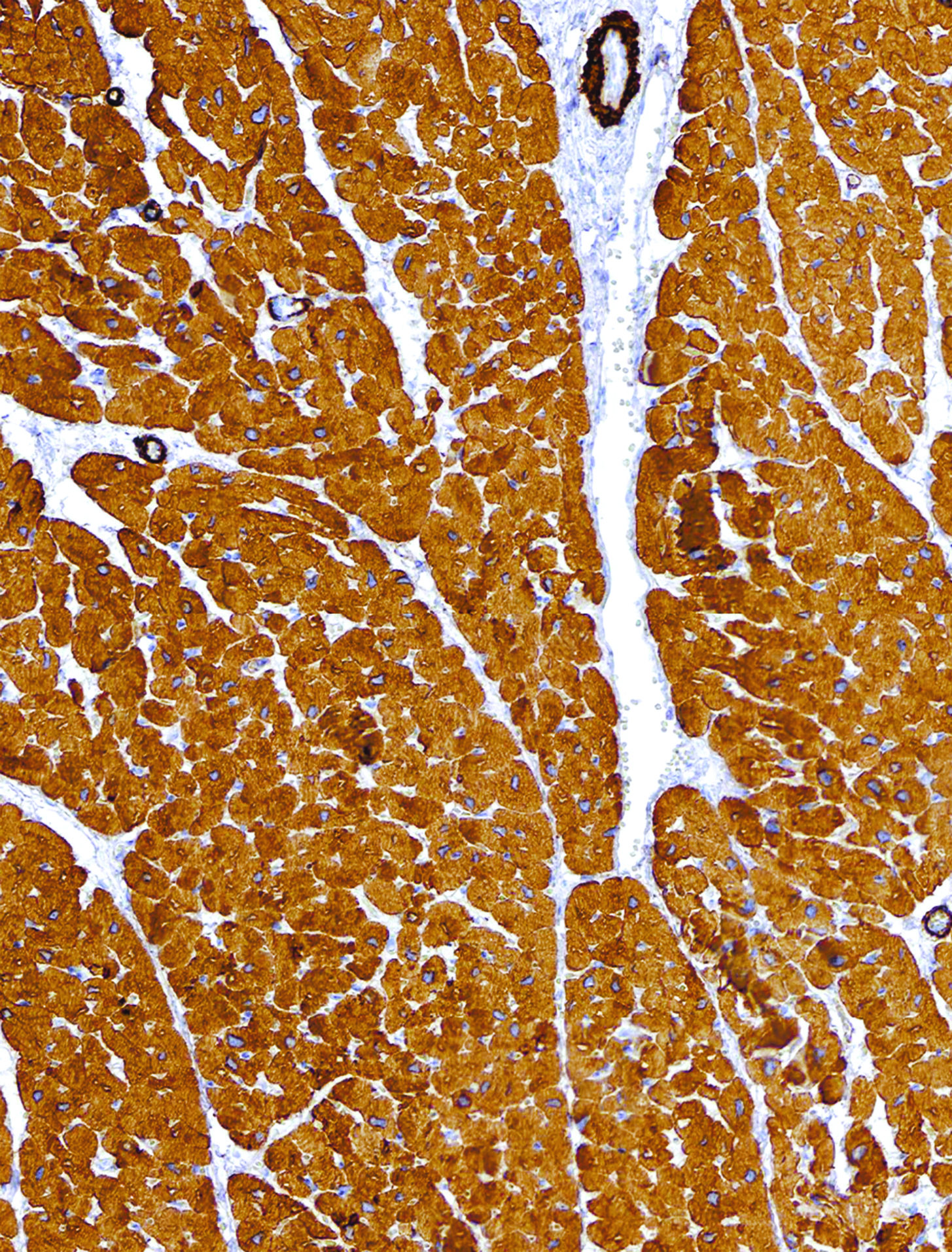 Actin is part of the cytoskeletal system of every cell type. It can be classified based on isoelectric points as alpha, beta, and gamma. Muscle Specific Actin includes those of the alpha and gamma isotypes. Skeletal, smooth, and cardiac muscle cells will all stain positively with Anti-Muscle Specific Actin, but mesenchymal cells, not including myoepithelium, will stain negatively. Normal and neoplastic non-muscle cells, including vascular endothelial and connective tissues, carcinomas, melanomas, and lymphomas, will also be negative for muscle specific actin. The use of Anti-Muscle Specific Actin in concert with Anti-Smooth Muscle Actin can allow for differentiation between rhabdomyosarcoma and leiomyosarcoma, as muscle specific actin is found in rhabdomyoblasts, while smooth muscle actin is found in leiomyosarcomas.