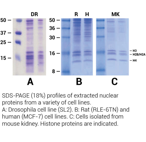 Histones and other DNA-binding proteins play an important role in chromosome organization, gene regulation and post-translational modification. Core components of histones can be covalently modified through methylation, acetylation, phosphorylation and sumoylation. These modifications are essential for gene expression, regulation, DNA repair and chromosome condensation. Minute™ Histone/DNA Binding Protein Extraction Kit is designed to efficiently extract histones and other DNA-binding proteins from cultured cells and isolated cells. Unlike many other commercial histone extraction kits that employ acid or high-salt extraction methods, Minute™ Histone/DNA Binding Protein Extraction Kit is efficient in extracting histones and other DNA-binding proteins that can be used for internal controls for histone modification analysis. In comparison, acid extraction protocol that selectively extracts basic proteins and a good internal control is usually not possible. Minute™ Histone/DNA Binding Protein Extraction Kit can extract histones from 0.5 to 5 million cells in less than 10 minutes with high protein yield (1-2.5 mg/ml), making it the fastest and most robust histone extraction kit available on the market.
