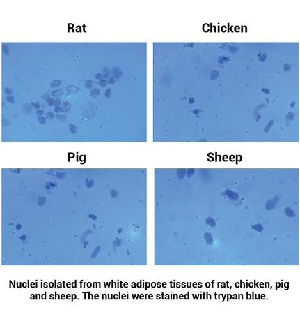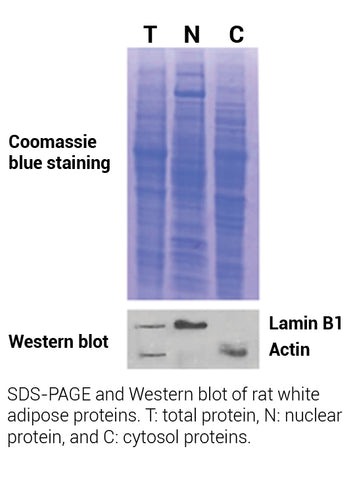 Adipocytes are the major energy storage sites in the body, and they also have critical endocrine functions. Therefore, understanding the development and function of adipocytes is essential to understanding metabolic homeostasis under physiological and pathological conditions. Fractionation of cellular components into a single nucleus and cytosolic fraction is a common lab practice. However, when it comes to adipose tissue and adipocytes, separating these two fractions is quite challenging due to the low protein content and the presence of abundant lipid droplets. Methods developed by different labs are tedious and unpractical, requiring up to 50 grams of starting materials. This kit provides a quick and simple protocol for obtaining high-quality single nuclei and cytosol fractions from adipose tissue and adipocytes. Only milligrams of starting material are required, making it possible to isolate nuclei and extract proteins from biopsies and limited tissues. The intact nuclei isolated can be used in many applications such as scRNA-seq, ATAC-seq, SDS-PAGE, immunoblotting, ELISA, IP, protein localization, gel mobility shift assays, 2-D gels, and other applications.