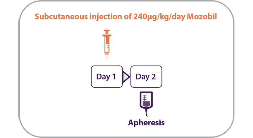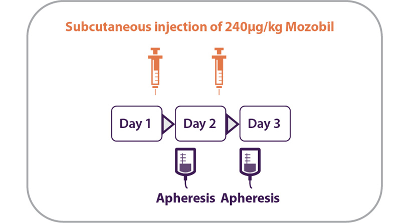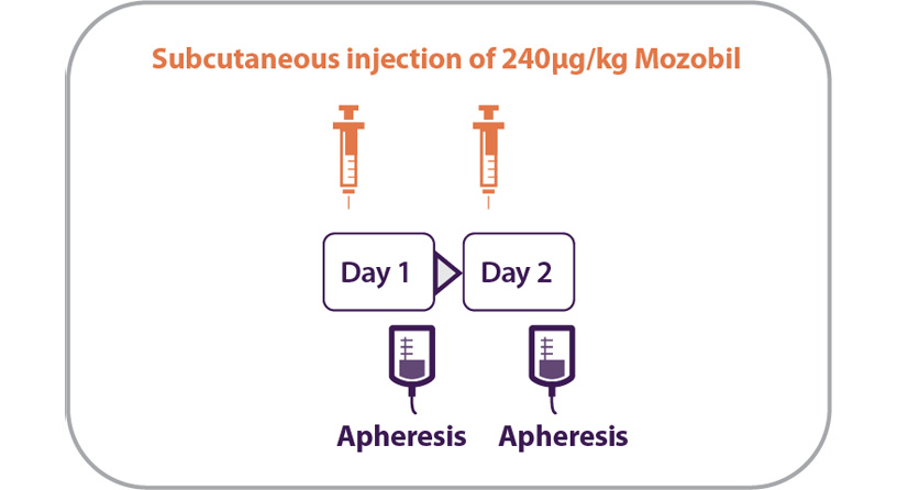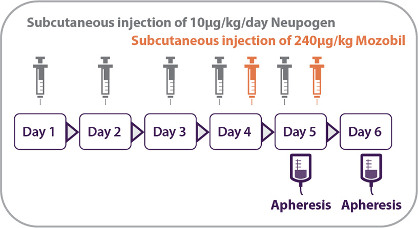 Plerixafor (Mozobil) 240ug/kg/day x 2 days (mornings), apheresis day 1 and day 2 (afternoon); 6 hours between injection and collection