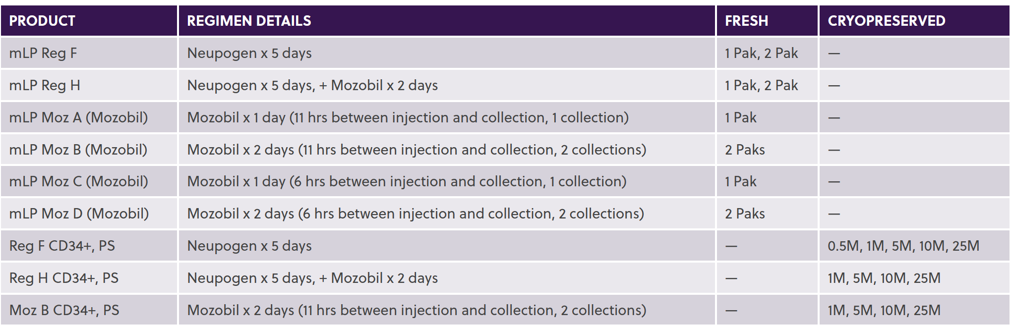 AllCells is the industry leader in supplying mobilized Leukopaks with the shortest lead time on the market. We have six different mobilization regimens available using G-CSF (Neupogen®), plerixafor (Mozobil®), or a combination of the two drugs as well as CD34+ cells isolated from mobilized Leukopaks.