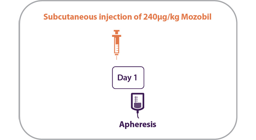 Plerixafor (Mozobil) 240ug/kg/day x 1 day (morning), apheresis day 1 (afternoon); 6 hours between injection and collection6